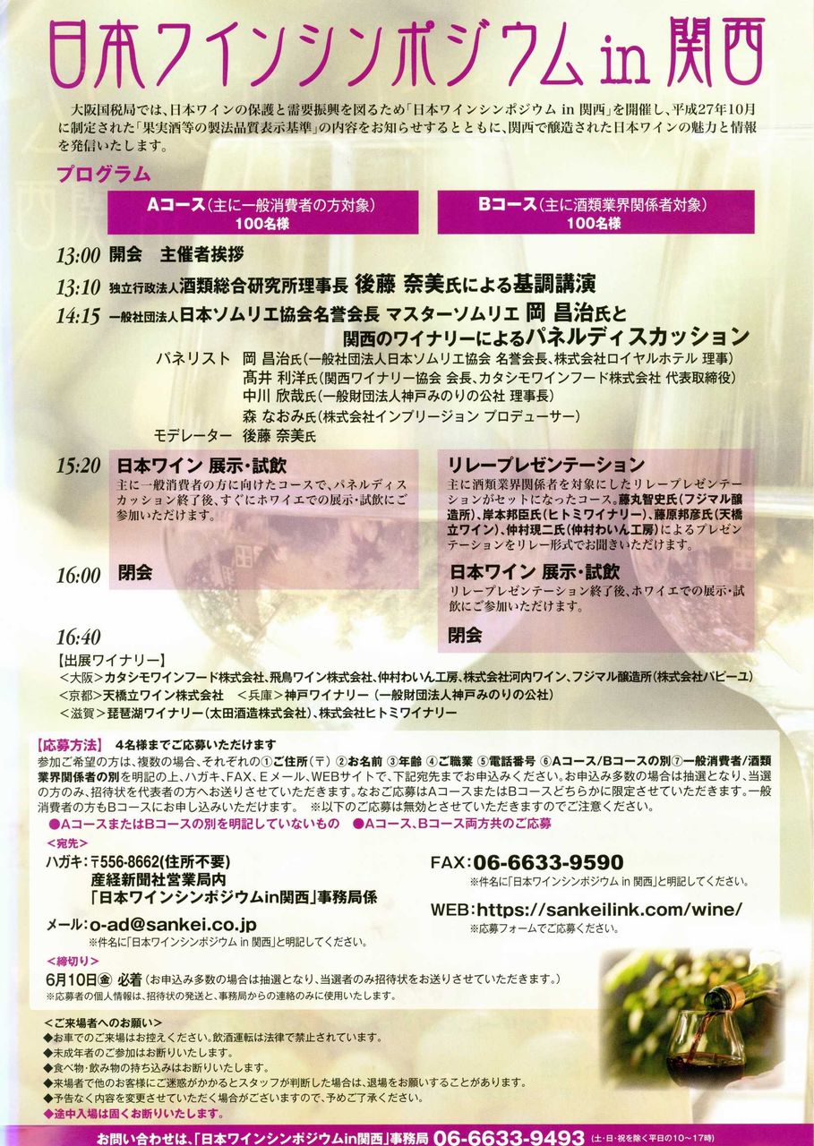 お問合せ:「日本ワインシンポジウムin関西」事務局06-6633-9493(土・日・祝を除く平日の10時~17時)